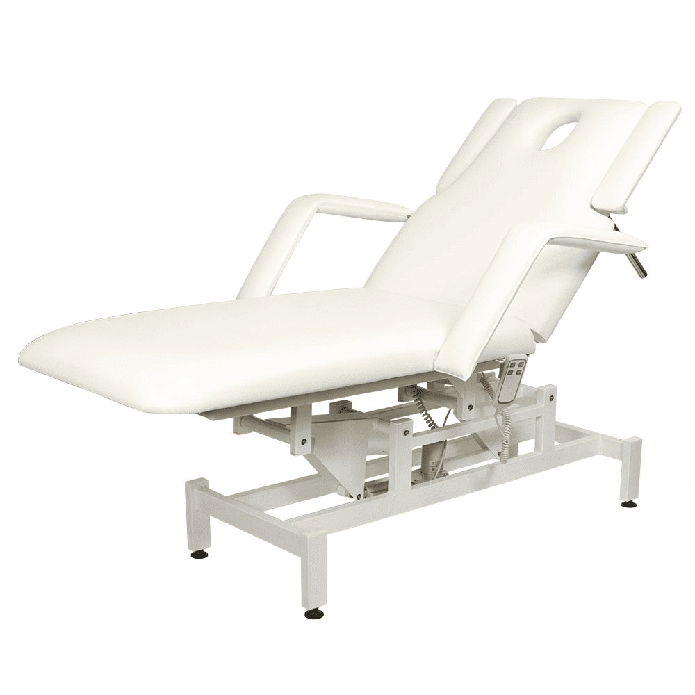 Кушетка разделена на два мягких сегмента, положение которых регулируется. С помощью двух встроенных электромоторов можно дистанционно регулировать угол наклона спинки и высоту кушетки. В комплект поставки входит удобный пульт управления электроприводом. Каркас и основание из металла с защитным покрытием.