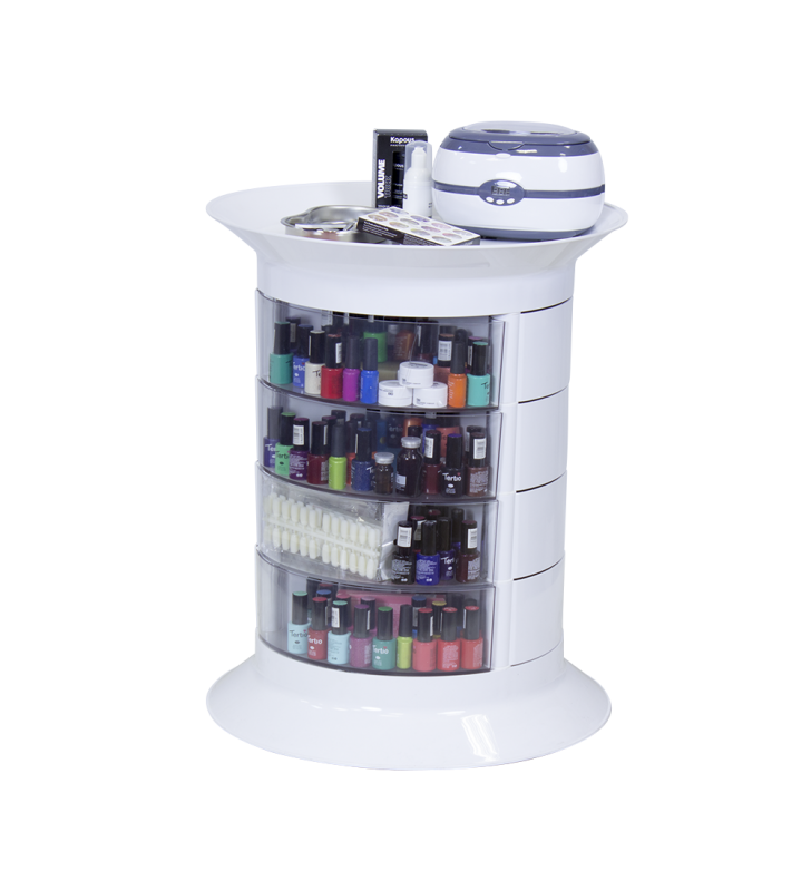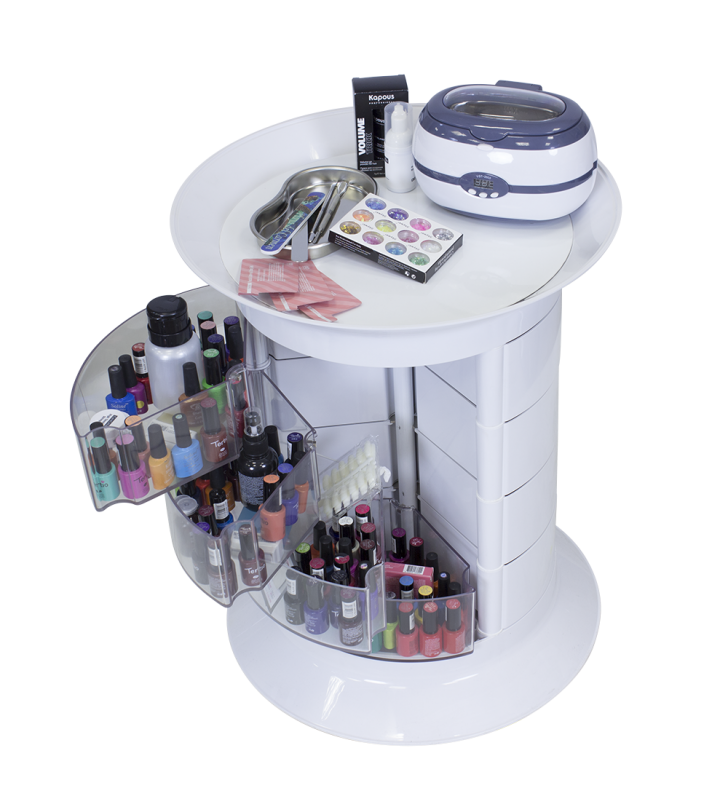 На верхней полочке можно положить инструмент первой необходимости. Остальные приспособления вместе с косметологическими средствами можно компактно разместить в ящиках, которые свободно и бесшумно выдвигаются. Для часто используемых принадлежностей предусмотрены 4 прозрачных ящичка. Мастер с легкостью найдет нужный инструмент или средство, не открывая ящик. Для быстрого перемещения по рабочей зоне тележка укомплектована маневренными колесиками. Установить оборудование можно даже в помещениях с маленькой площадью благодаря компактным размерам.