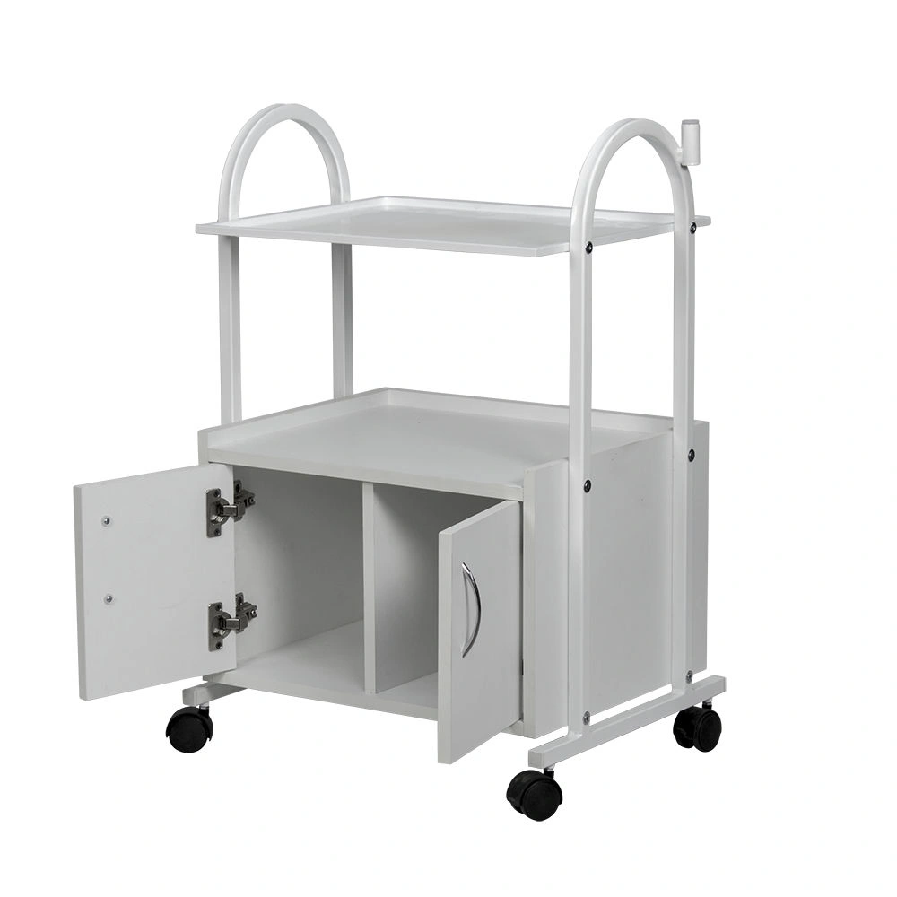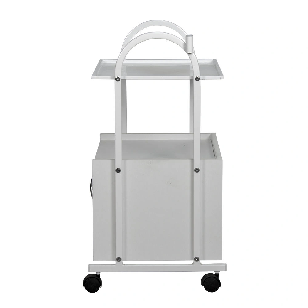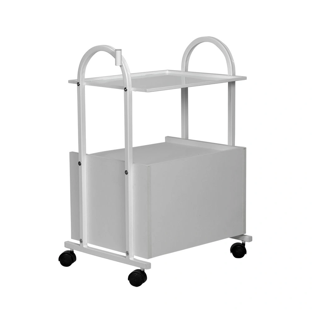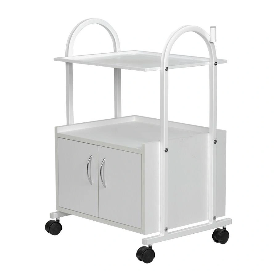 Купить косметологическую тележку МД-103 можно в нейтральном белом цвете, который будет сочетаться с любой палитрой помещения и базового оборудования. Полка и элементы каркаса выполнены из прочного металла, окрашенного защитной краской. Шкафчик выполнен из качественной ДСП с влагоотталкивающим ламинированным покрытием. Для удобного перемещения модель комплектуется вращающимися колесами из прочного пластика.
