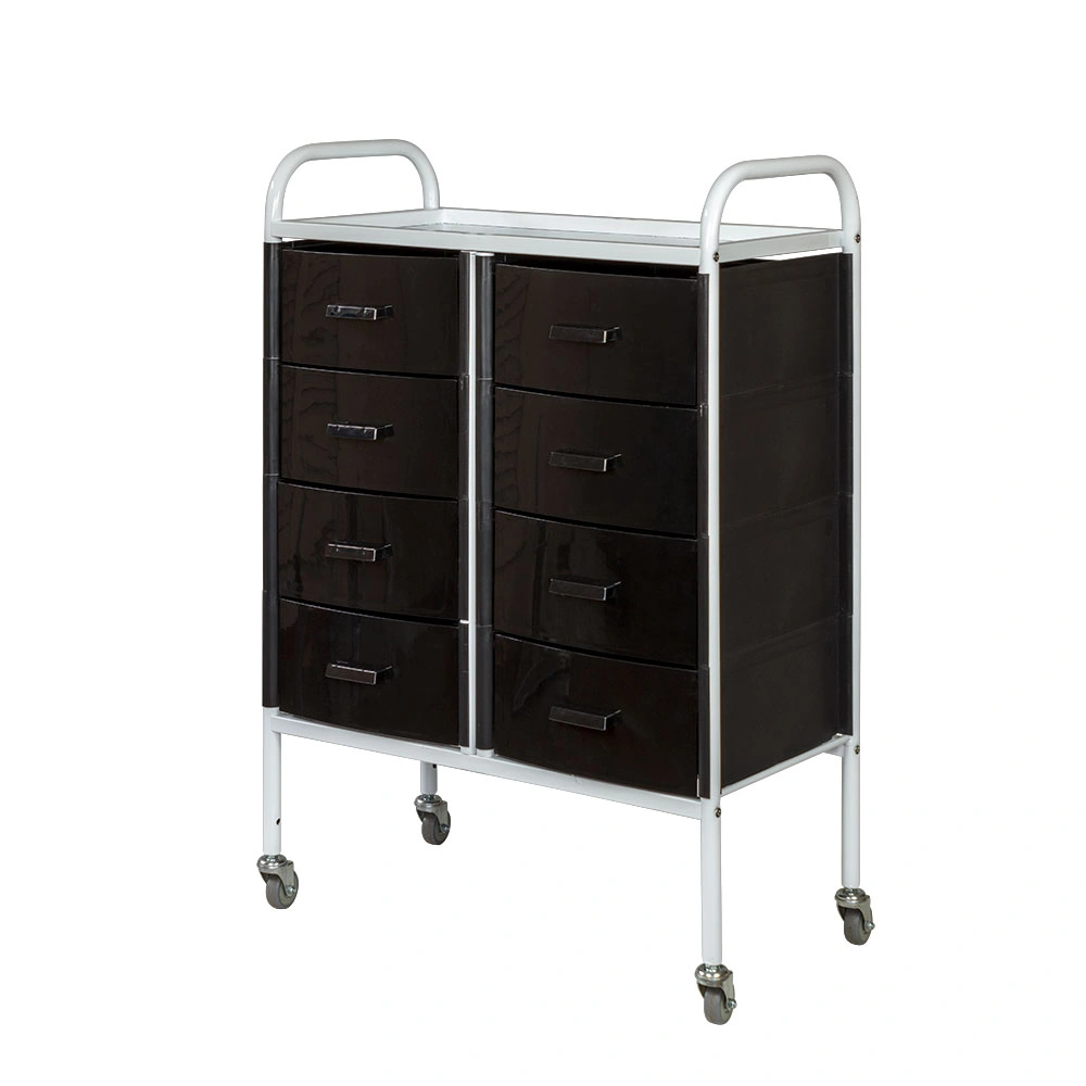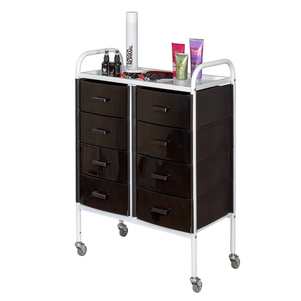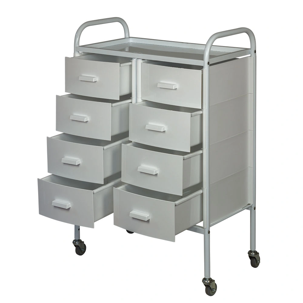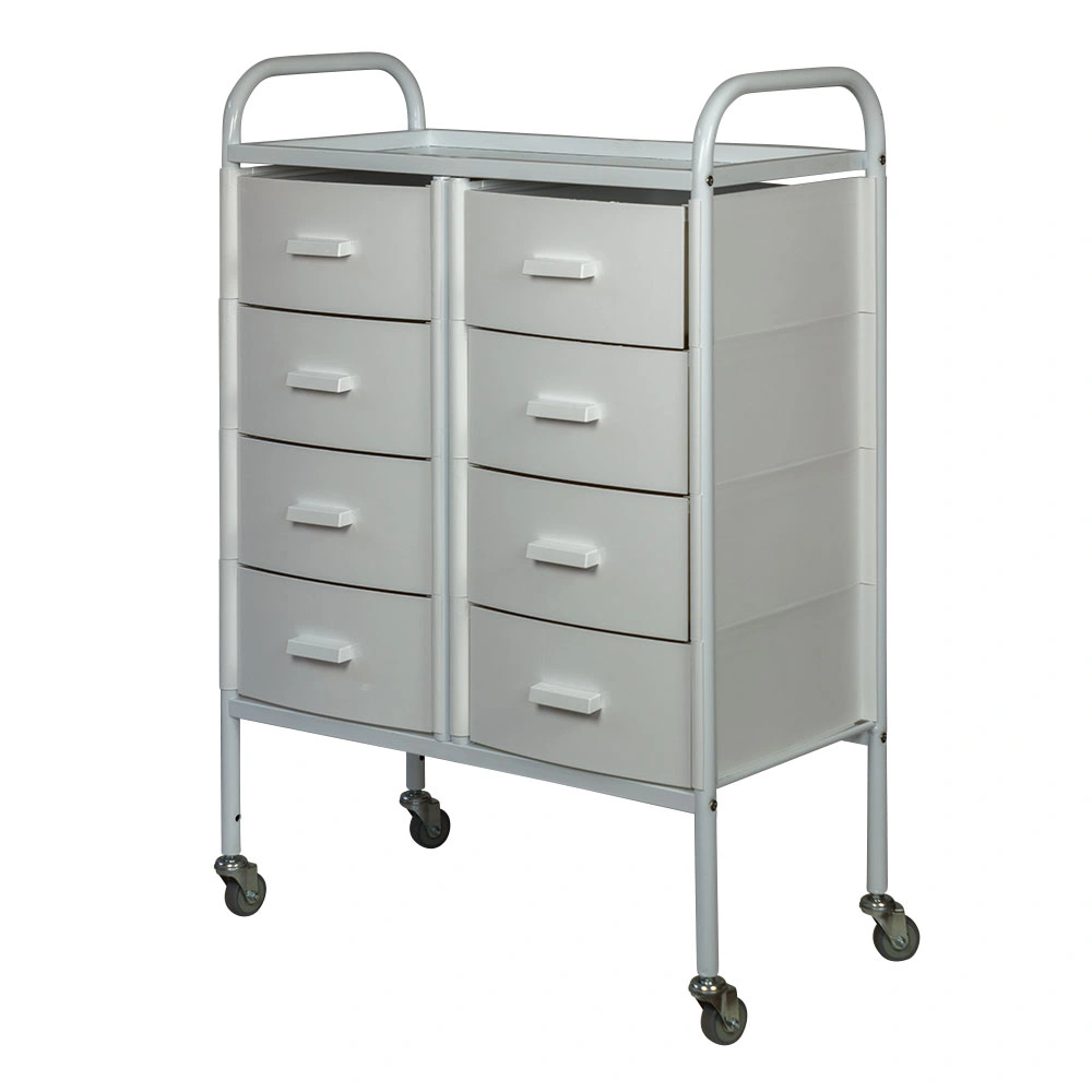 Такое косметологическое оборудование подойдет для организации двух рабочих мест. В распоряжении мастеров 8 выдвижных ящиков для инструментов и расходных материалов. Верхняя полка предназначена для приспособлений, используемых во время проведения процедур. Встроенные маневренные колеса позволят мастеру с легкостью перемещать косметологическое оборудование.
