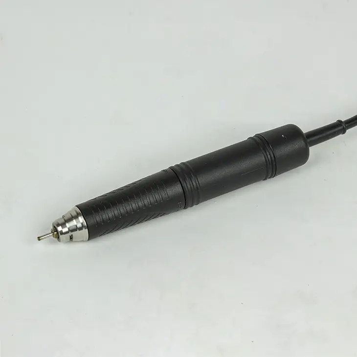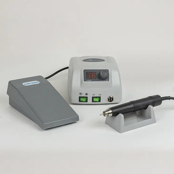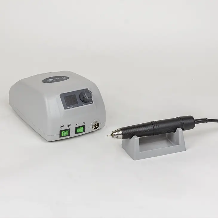 На верхней части панели блока питания находятся кнопки реверса, включения и выключения, регулятор скорости и разъем для подключения ручки. К блоку присоединена ручка с микромотором. Цанговый зажим плотно фиксирует фрезу, не допуская проворачивания инструмента во время процедуры. Для фрез в корпусе блока предусмотрены специальные отверстия.