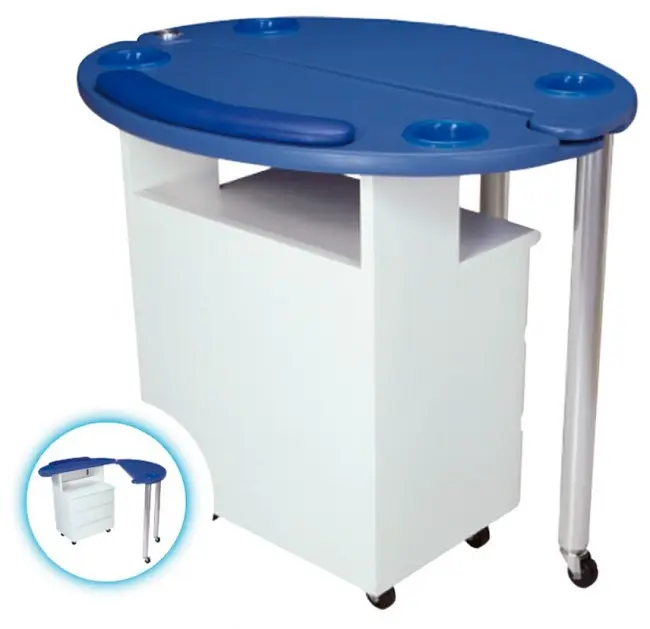 Стол маникюрный МД-9007 (раздвижной) с вместительной тумбой на колесах и хромированными ножками. Он позволяет максимально использовать пространство помещения, что очень важно при минимальной площади рабочего кабинета или для работы на дому. Круглая столешница состоит из двух частей, которые соединены металлическим креплением. В каждой части предусмотрено по два отверстия с пластиковыми емкостями для хранения различных расходных материалов, аксессуаров и прочих рабочих принадлежностей. Для изготовления столешницы применяется ДСП с ламинированным покрытием приятного синего цвета.