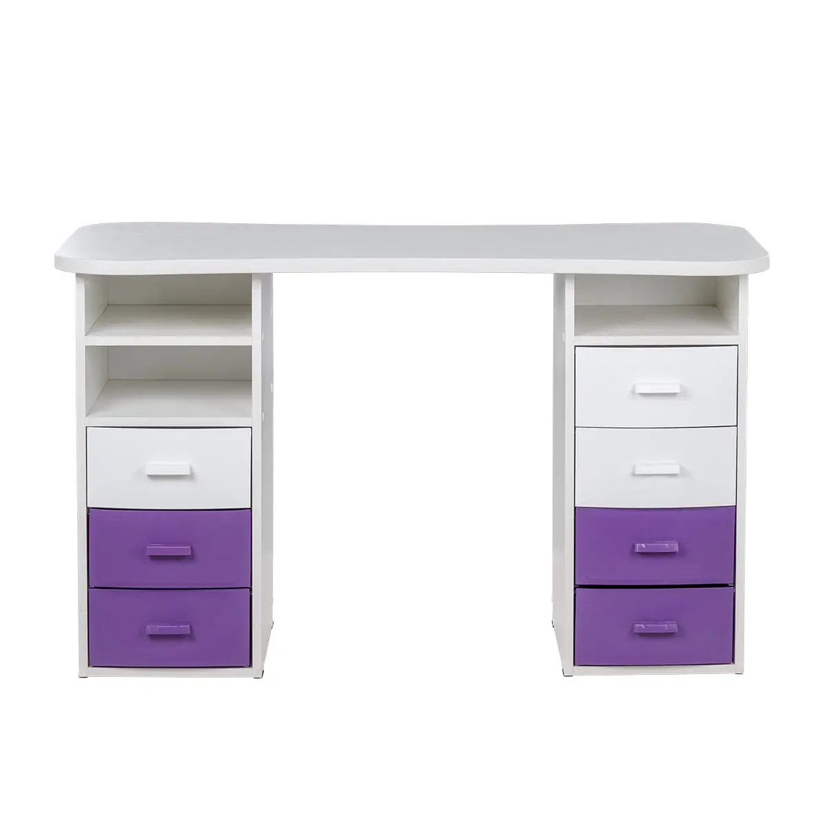 Корпус тумбы, полки и столешница маникюрного стола выполнены из ЛДСП высокого качества. Кромка из ПВХ надежно защищает торцы маникюрного стола от сколов и проникновения влаги. Специальные подпятники не допустят царапин на полу. Ящики из прочного пластика не бояться легкого механического воздействия и влияния моющих средств. Можно заказать разные комбинации расцветок ящиков из доступных цветов.