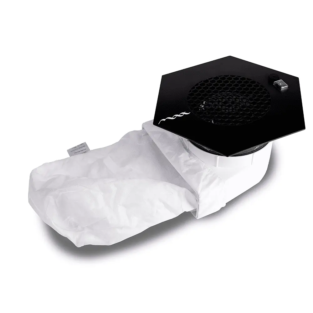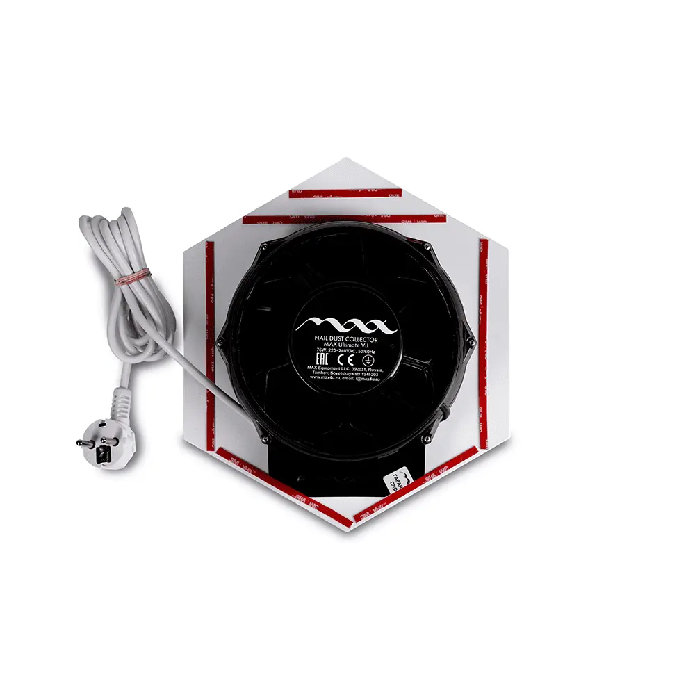 Врезная вытяжка Ultimate 7 – это мощный пылесборник, предназначенный для мастеров маникюра, принимающих клиентов в салонах красоты или выезжающих на дом. Изделие обладает продуманным дизайном, выглядит стильно, предлагается в двух цветовых решениях – черном и белом, поэтому можно легко подобрать вариант под интерьер кабинета. В корпусе установлен мощный вентилятор с 9 лопастями, которые прокачивают больше воздуха, чем аналогичные устройства других производителей. Кроме того, лопасти установлены близко к краю крыльчатки, поэтому вентилятор всасывает большее количество ногтевой пыли.