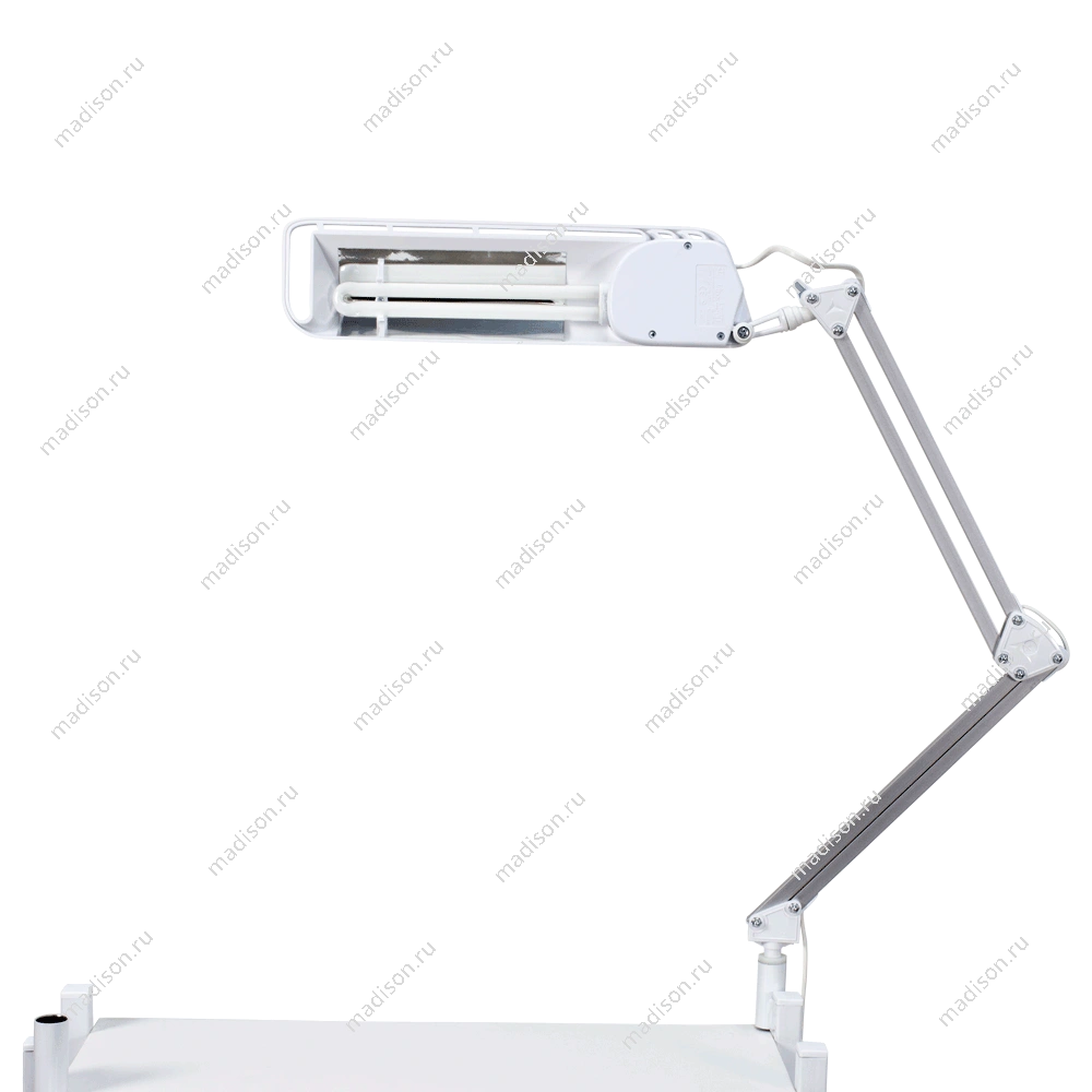 Настольная лампа крепится к поверхности с помощью струбцины черного цвета. При этом толщина стола не должна превышать 25 мм. Оборудование имеет компактные размеры и не занимает пространства рабочей зоны стола. Сменная люминесцентная лампа имеет длительный срок службы и дает качественный рассеянный свет. Она не напрягает зрение и позволяет рассмотреть даже самые мелкие детали. Работает данное устройство от бытовой сети с напряжением 220 В и имеет мощность 11 Вт. Удобная и практичная лампа маникюрная от магазина МЭДИСОН идеально подойдет для работы в кабинете и домашнего использования. Для гармоничности дизайна рабочего места в одном цветовом решении с лампой можно приобрести подставку под лаки и маникюрную подушку.