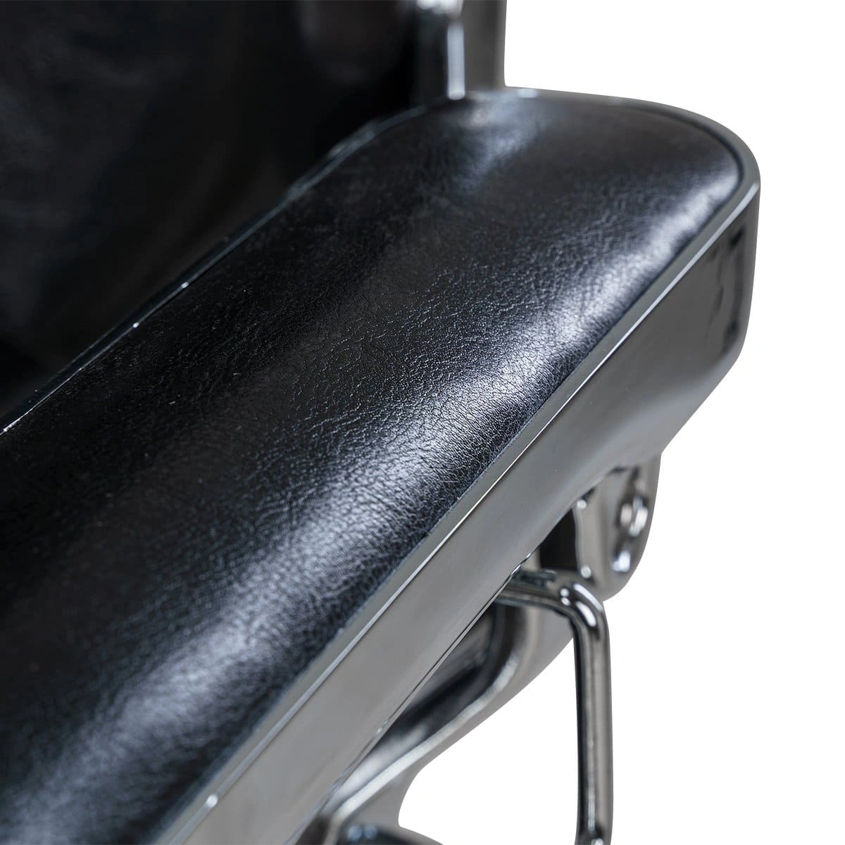 В дизайне кресла присутствует много металлических деталей и фурнитуры под медь или шагрень. Подлокотники и подставка на подножках обиты экокожей, что придает креслу большей солидности, а клиенту максимального комфорта.