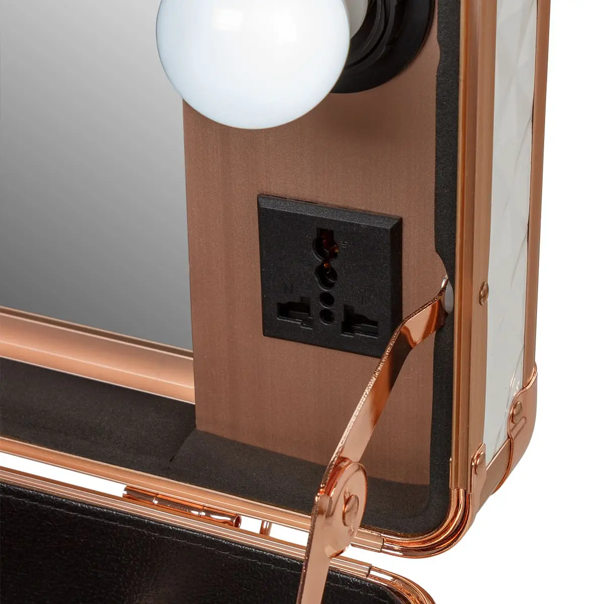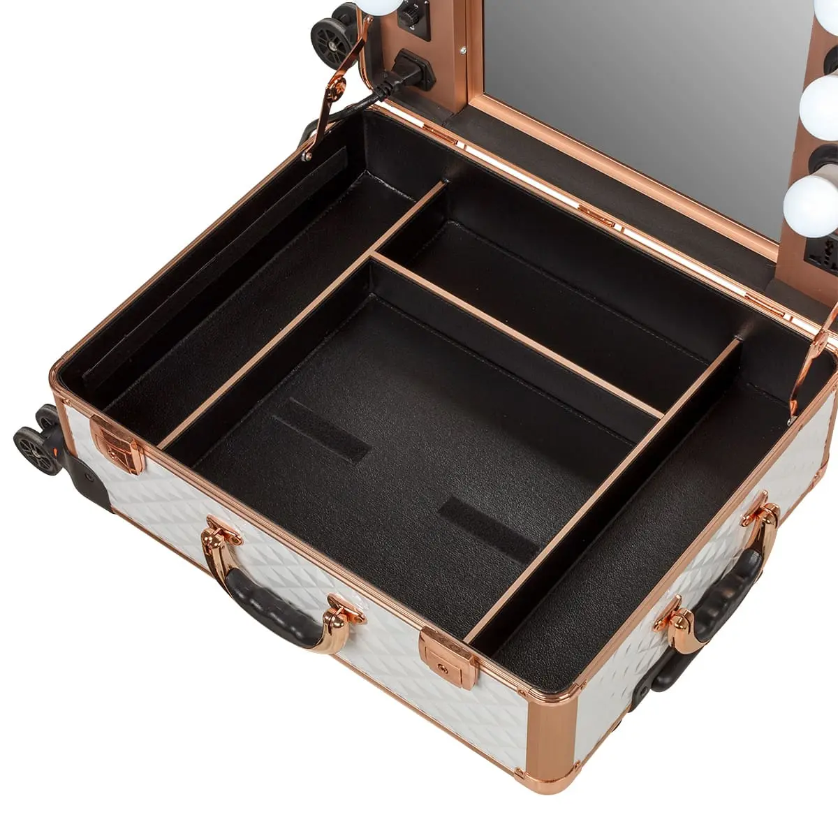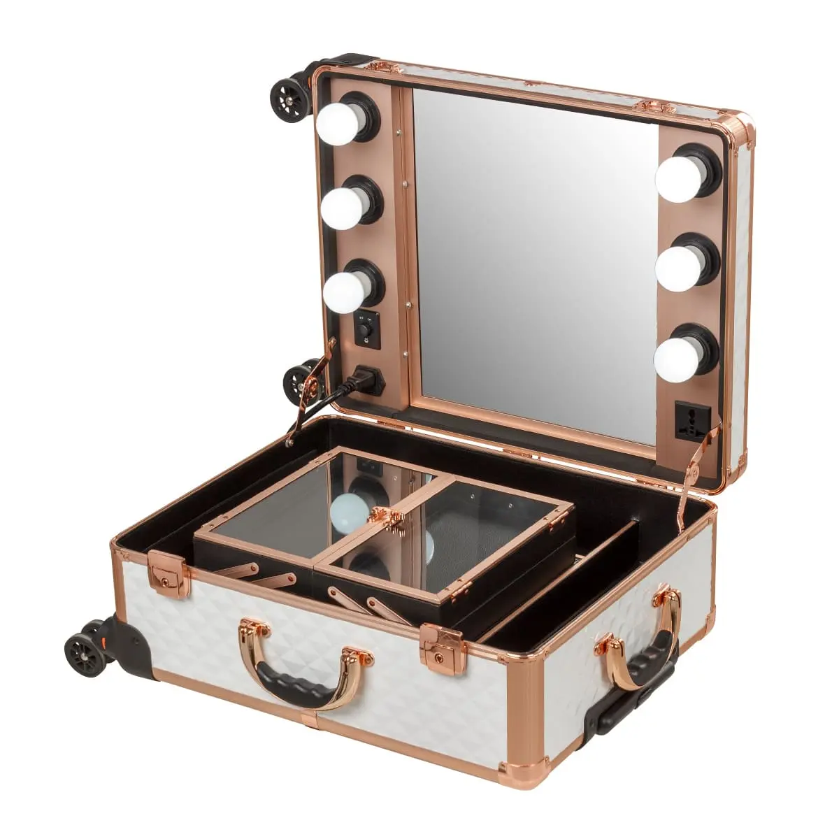 В разложенном виде студия представляет собой удобный столик с двумя закрытыми и двумя открытыми полочками. Всё рабочее место освещено благодаря встроенным экономичным LED лампам в верхнюю крышку кейса. В ящичках достаточно места, чтобы хранить косметику визажиста в порядке и всегда под рукой. В комплект также входят замки и ключи, обеспечивающие дополнительную безопасность. В корпус студии вмонтирована розетка для электроприборов, шнур для включения ламп и регулятор яркости освещения.