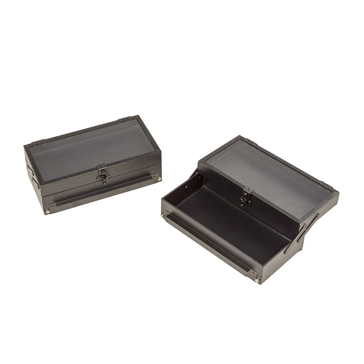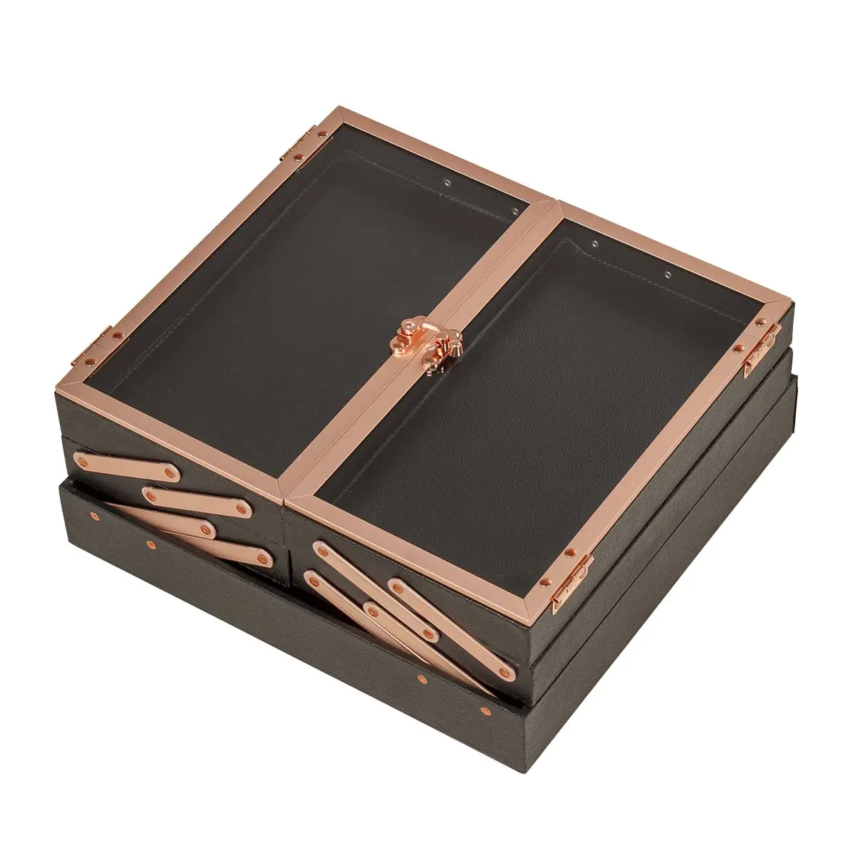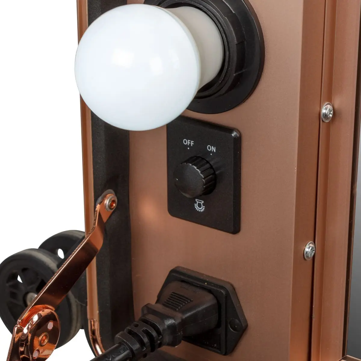 В разложенном виде студия представляет собой удобный столик с двумя закрытыми и двумя открытыми полочками. Всё рабочее место освещено благодаря встроенным экономичным LED лампам в верхнюю крышку кейса. В ящичках достаточно места, чтобы хранить косметику визажиста в порядке и всегда под рукой. В комплект также входят замки и ключи, обеспечивающие дополнительную безопасность. В корпус студии вмонтирована розетка для электроприборов, шнур для включения ламп и регулятор яркости освещения.