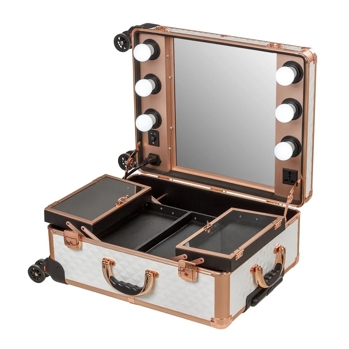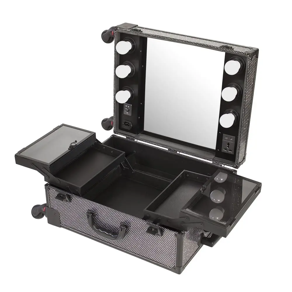 Мобильная студия визажиста VZ-58 с лёгкостью поможет организовать рабочую зону в любом салоне красоты или на выездной работе. Компактный кейс можно взять с собой куда угодно. Чемоданчик оснащён вращающимися колёсами и удобной телескопической ручкой. Мастеру не придётся носить тяжёлые кейсы с косметикой и инструментом. Такая студия идеальна для мастеров, кто большую часть времени проводит в разъездах.