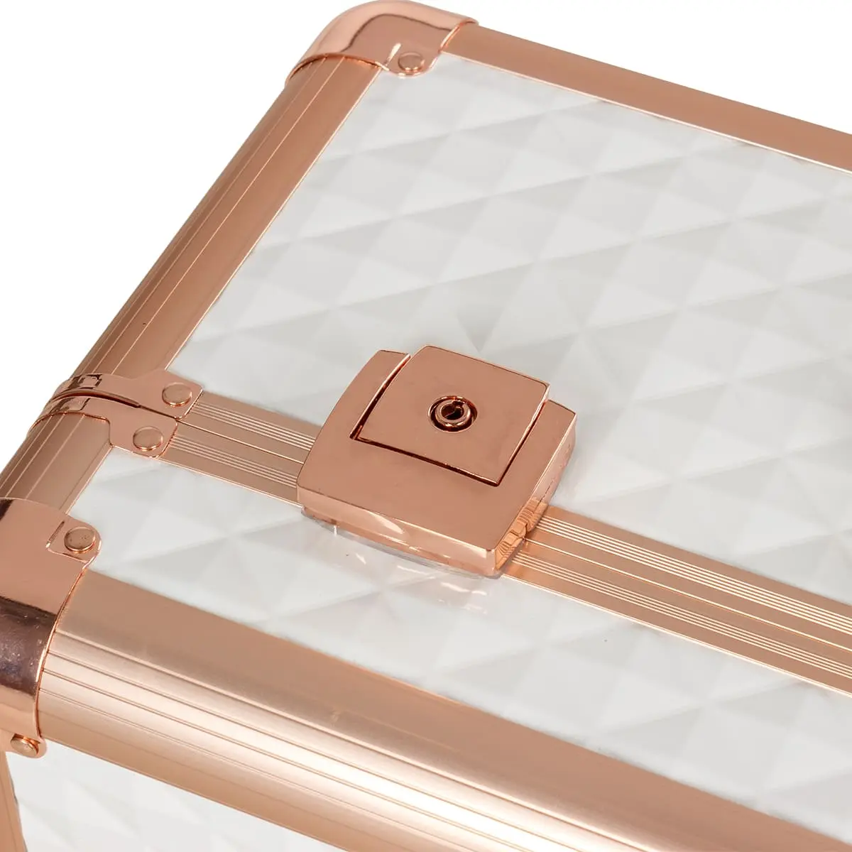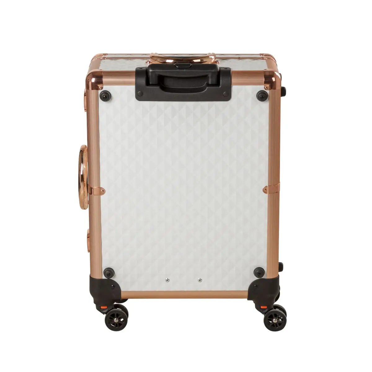 Чемоданчик изготовлен из ПВХ. Материал устойчив к воздействию тепла, света и влаги. Поэтому мастер может быть спокоен за сохранность косметических средств. Поверхность студии для визажиста имеет интересную структуру и декорирован накладными элементами под цвет бронзы. Ручка изготовлена из алюминия. Колёсики из качественной резины.