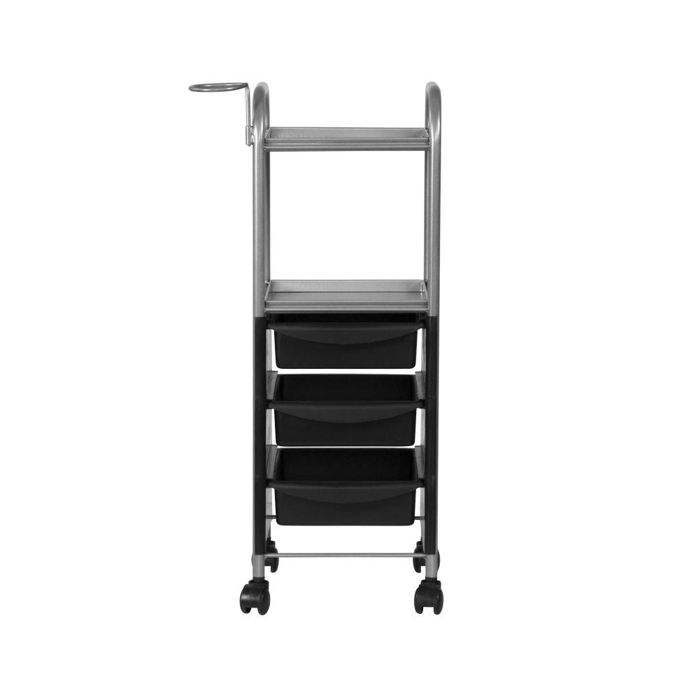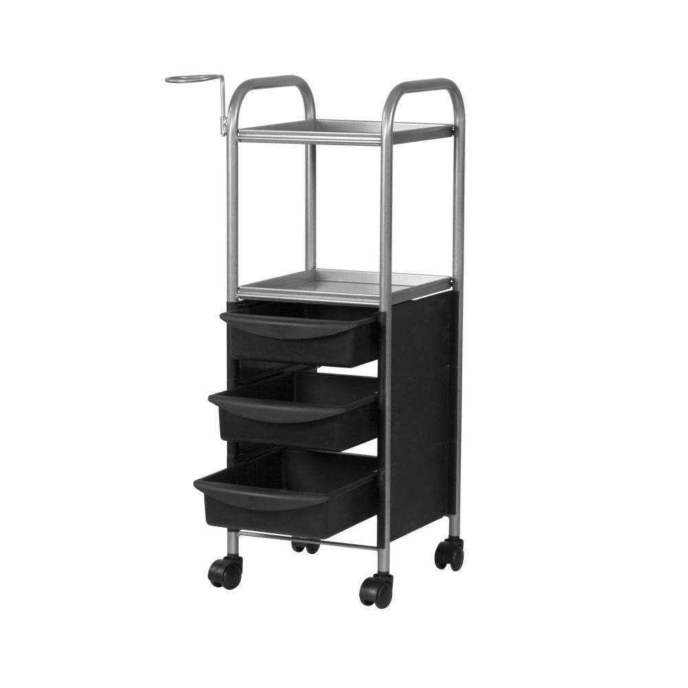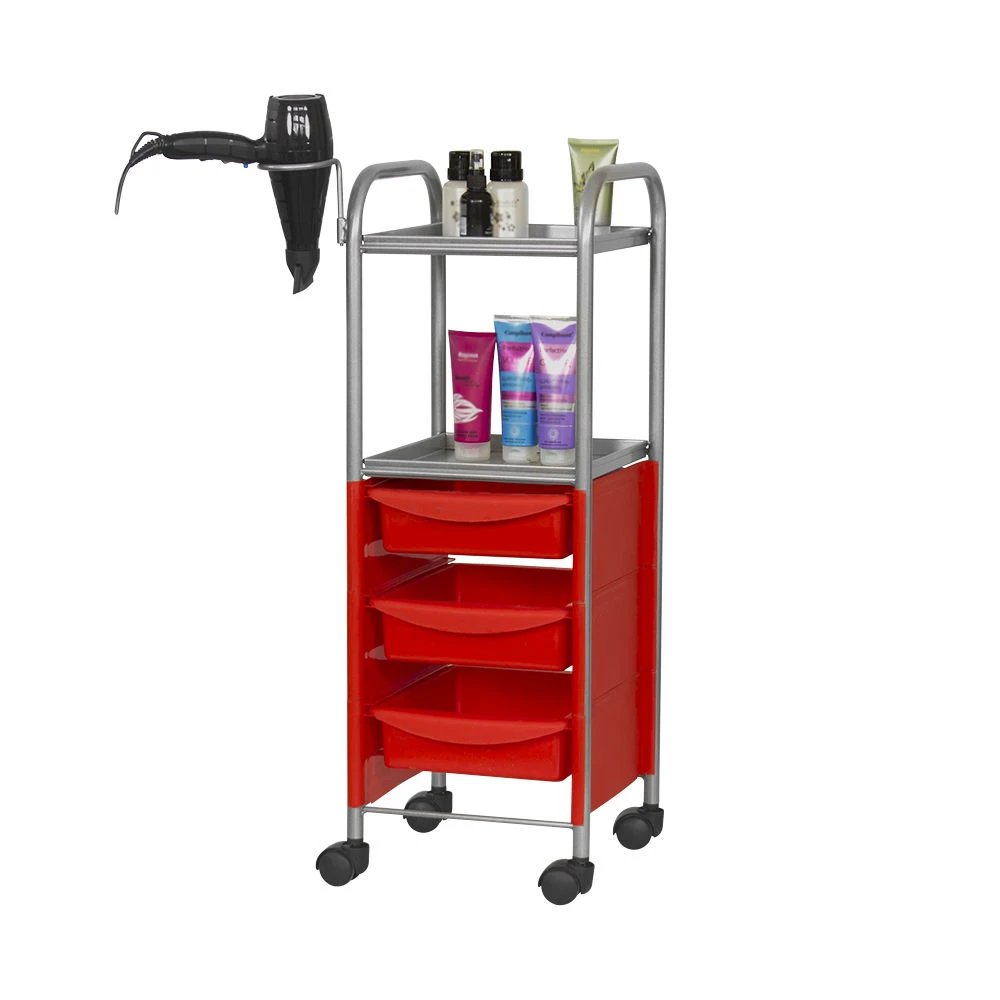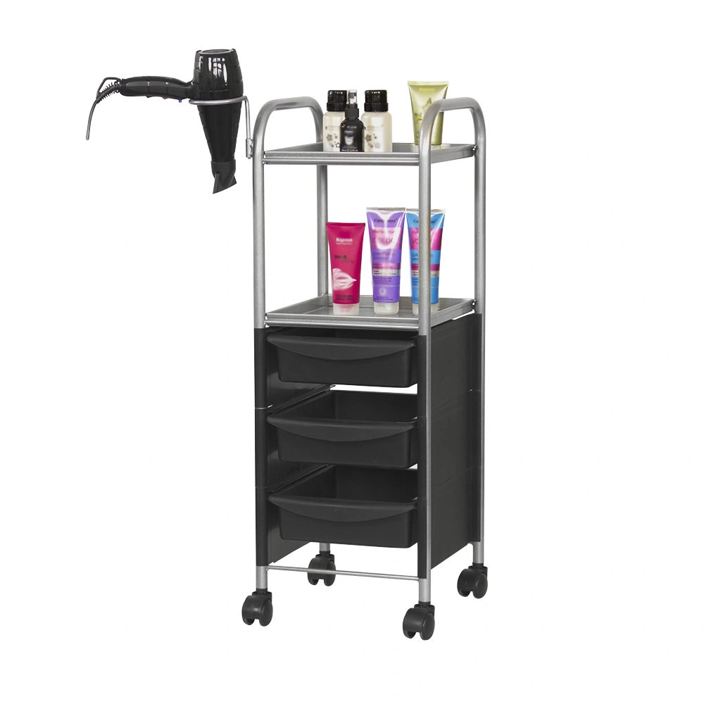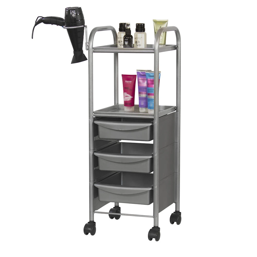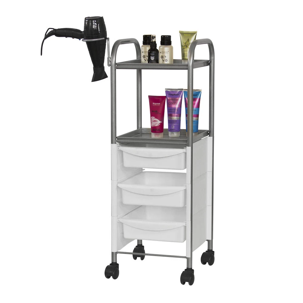 Наличие бортиков убережет инструмент от случайного падения. Практичное дополнение парикмахерской тележки – удобный держатель для фена. Оборудование можно переместить в любую точку салона благодаря манёвренным колесикам.