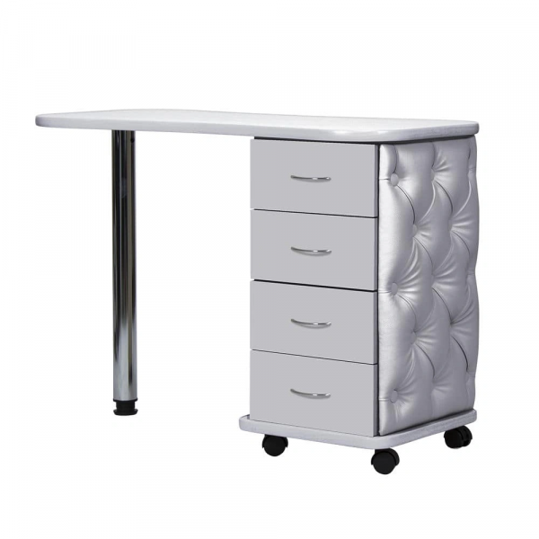 Комплектация: столешница, тумба, четыре выдвижных ящика, стальная ножка, колеса.