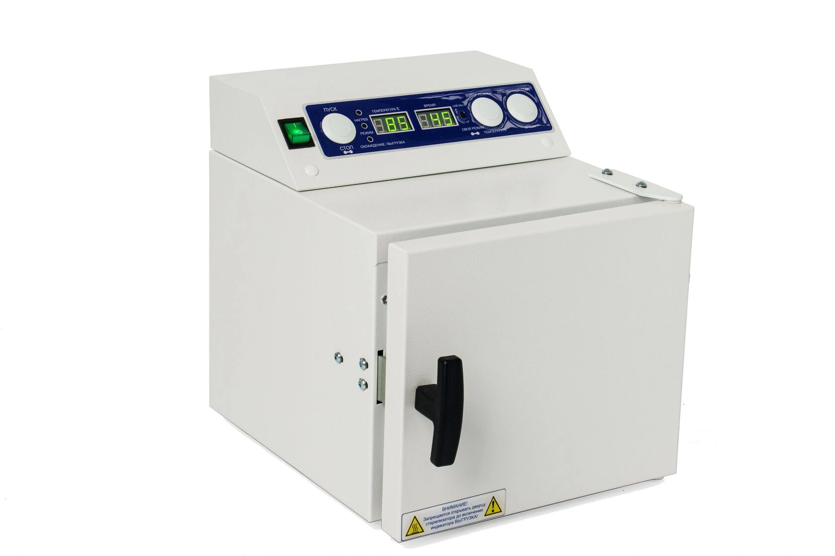 Стерилизатор "Ферропласт" при загруженной стерилизационной камере должен обеспечивать автоматическую поддержку температурных режимов в диапазоне от +85°С до +180°С и времени стерилизационной и дезинфекционной выдержки, а также пользовательского программируемого режима +50°С до +200°С, интервалом от 1 до 999 минут.