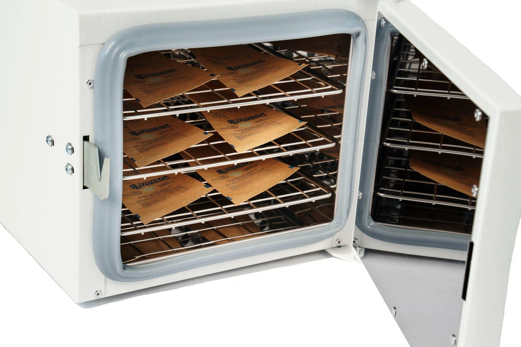 Стерилизационная камера разработана методом компьютерного моделирования, с целью достижения максимального нагнетания воздуха, что позволяет располагать инструмент в стерилизационной камере на 3 полочках одновременно.